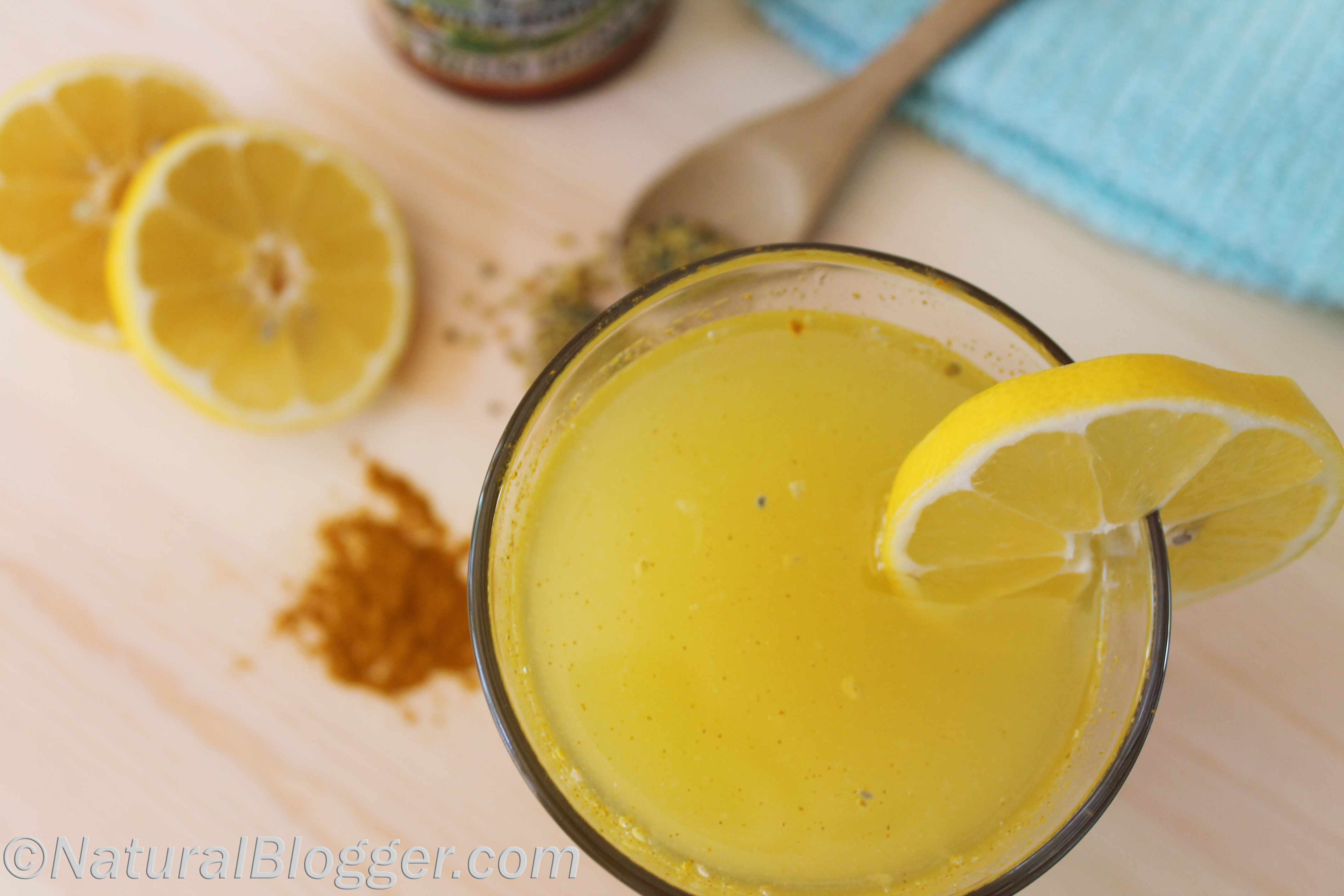 Ingredients: 1 lemon – juice squeezed 1 teaspoon turmeric powder, or 2 inches fresh turmeric root – juiced 1 teaspoon bee pollen 1 teaspoon honey – raw organic honey if possible 1 cup water or more – it is better to use warm water Directions: Simply combine all of the ingredients and mix with a wooden spoon. Drink immediately. Cheers! 🙂